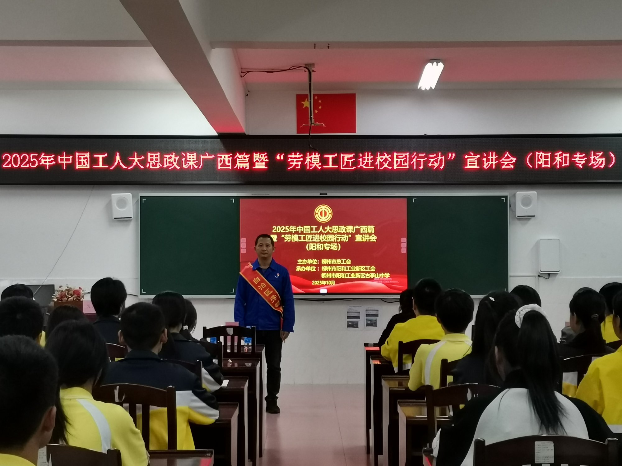 10月31日,柳州市陽和工業新區工會“勞模工匠進校園”宣講活動走進陽和工業新區古亭山中學,該校百余名師生到場聆聽。