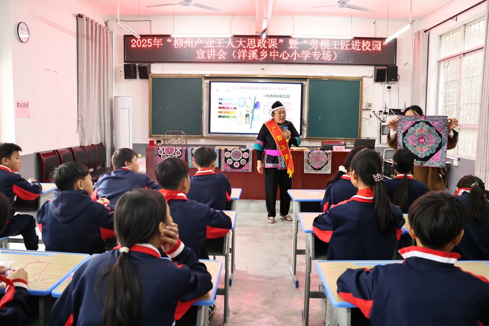 11月12日上午,2025年“柳州產業工人大思政課”暨“勞模工匠進校園”宣講會在三江侗族自治縣洋溪中心小學溫情開講。自治區非物質文化遺產項目代表性侗族刺繡傳承人、“廣西工匠”楊甜帶著刺繡教具,為全校師生帶來一場兼具精神感召與文化浸潤的宣講。